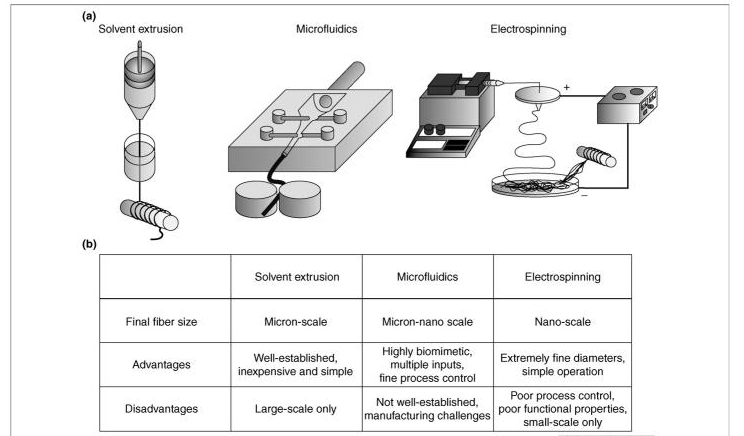 Nell'immagine proposta a lato, sono rappresentati i 3 metodi principali per poter realizzare applicazioni che derivano dalla tela dei ragni. La tabella mostra i pro e i contro di queste tecniche. Da sinistra verso destra, aumenta la precisione del lavoro e conseguentemente la diminuzione della grandezza della fibra.