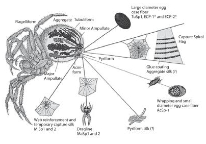 Questi ragni (orb-web spiders – nephila) hanno sette differenti complessi ghiandolari, ciascuno del quale sintetizza un tipo unico di fibra, diversificandosi per la struttura dei polimeri. Questo implica anche una diversa funzione per ogni tipologia di tela.