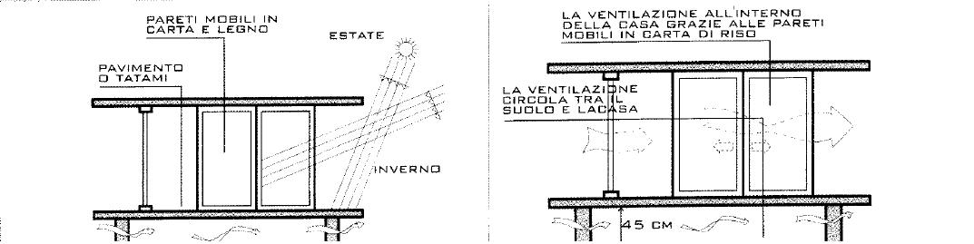 L’abitazione giapponese tradizionale presenta una serie di soluzioni tramandate nei secoli, in alcuni casi si può dire nei millenni, che permettono un magistrale controllo bioclimatico all’interno e nell’immediato intorno della casa, concentrate sull’uso di quattro elementi costruttivi: un’importante sistema di copertura, spesso organizzato su più livelli, molto aggettanti, a protezione di pioggia e sole (impedisce ai raggi estivi più incidenti l’ingresso diretto in casa, mentre lo permette ai raggi del soleggiamento invernale); una gestione assolutamente flessibile degli spazi interni tramite sistemi di pareti a pannelli di carta scorrevoli che favoriscono infinite modalità di ventilazione naturale trasversale negli spazi interni delle case (e che hanno anticipato di secoli alcune sperimentazioni di questi ultimi anni tese a rivisitare il concetto spaziale-distributivo della casa contemporanea); un distacco dal terreno, in media di mezzo metro, al fine di creare le condizioni ottimali per una ventilazione (e quindi un controllo dell’umidità e del raffrescamento passivo) alla base della costruzione; ed infine pareti esterne in legno, mattoni di creta e bambù, che offrono una buona resistenza termica alla trasmissione del calore verso l’interno, dato che le abitazioni tradizionali in Giappone sono state concepite e perfezionate in climi con estati molto calde e umide.
