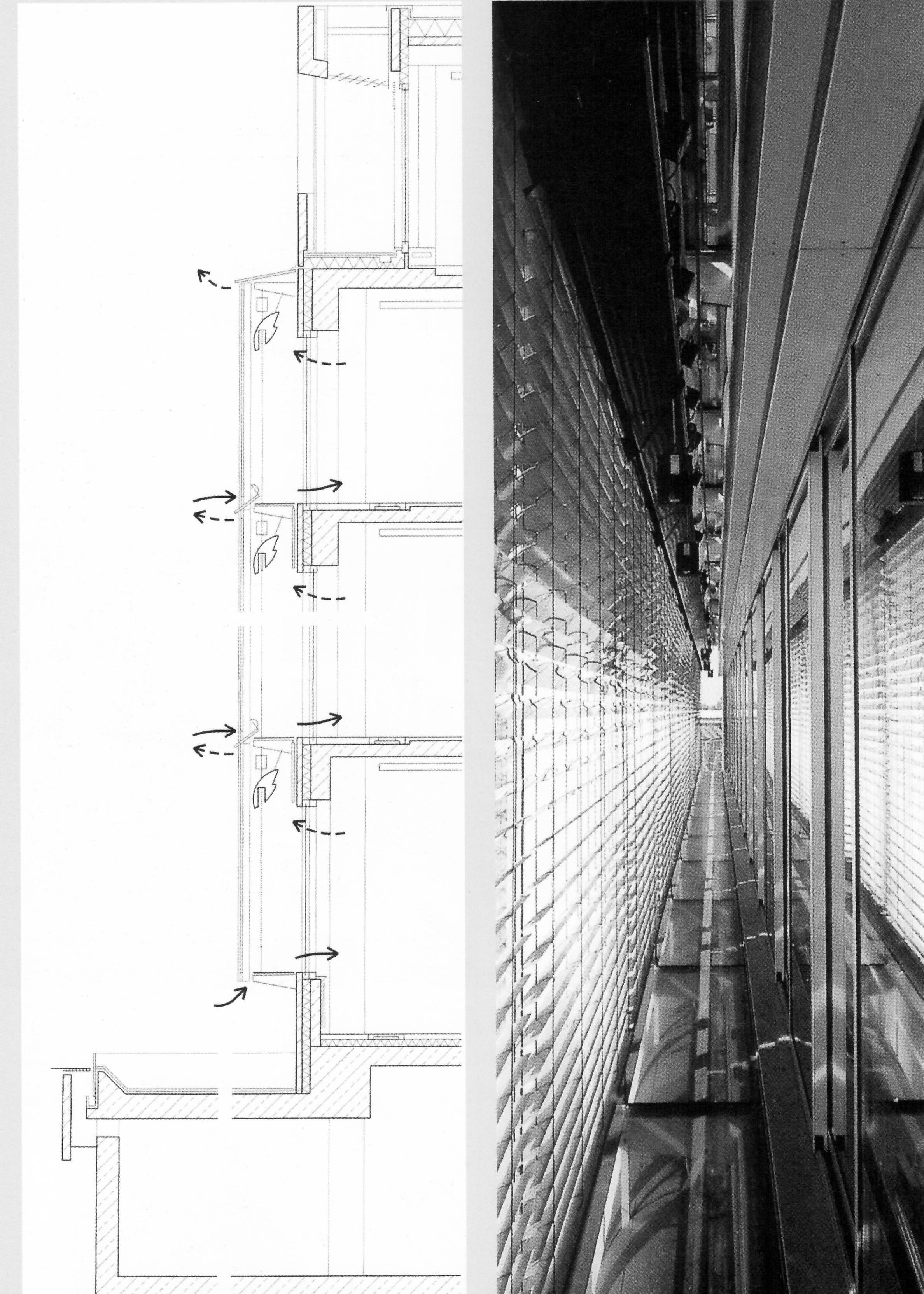 Germania, H. Leon, K. Wohlhage L’edificio, realizzato nel 2002, rappresenta un caso estremamente interessante di capacità di generare “passivamente” energia termica durante la stagione fredda minimizzando i costi di riscaldamento, senza però provocare d’estate un eccessivo surriscaldamento e dunque re-impiegare buona parte dell’energia risparmiata d’inverno per produrre il necessario raffrescamento. L’edificio è infatti dotato di un importante sistemi di doppia parete vetrata ventilata, che gli garantisce anche un ottimo isolamento termico, e che gli permette di godere della massima disponibilità energetica in entrambe le stagioni. La doppia parete vetrata assolve alla funzione di vero e proprio “motore termico” in quanto nella camera d’aria s’innesca per spinta idrostatica un flusso di aria ascensionale sfruttabile in qualunque situazione stagionale: in estate utile per espellere aria calda dagli ambienti interni, in inverno per immettervi aria esterna preriscaldata nell’intercapedine per effetto serra. Pertanto la serie di grandi partizioni-serra caratterizzate da una doppia stratificazione trasparente ma apribile e schermabile permette durante l’inverno la captazione solare per l’intero edificio e genera durante l’estate ombreggiamento (con le schermature mobili di cui è dotata) e ventilazione, grazie al contatto con le vasche d’acqua poste alla base dell’edificio. La doppia facciata ventilata simula il comportamento delle foglie da ombra che hanno l’interno ventilato ed aperture regolabili, stomi, che consentono alla foglia di traspirare per rinfrescarsi ma allo stesso tempo regolano tale traspirazione nel tempo e nella quantità.