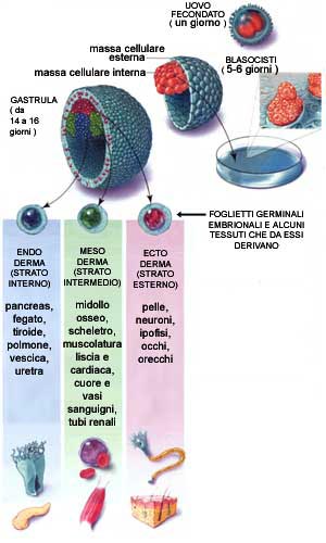 Questi tre "strati germinali" o "foglietti embrionali" daranno origine alle cellule costituenti l'intero organismo: l'endoderma, strato embrionale più interno, darà origine alle cellule di polmoni, fegato, pancreas e vescica; il mesoderma a quelle del midollo osseo, dell'apparato scheletrico, muscolatura, cuore, reni e vasi sanguigni; l'ectoderma originerà invece le cellule del sistema nervoso centrale e periferico, dei tessuti epiteliali, dell'apparato visivo e uditivo.