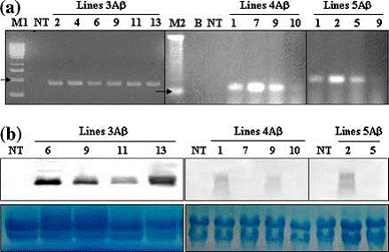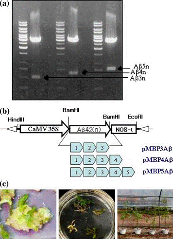(a) analisi della presenza del gene Ab tramite PCR. Il Dna viene estratto dalle foglie delle piante. In seguito esso viene amplificato tramite la tecnica PCR utilizzando primers specifici che amplificano i frammenti 3,4 e 5 della beta amiloide.