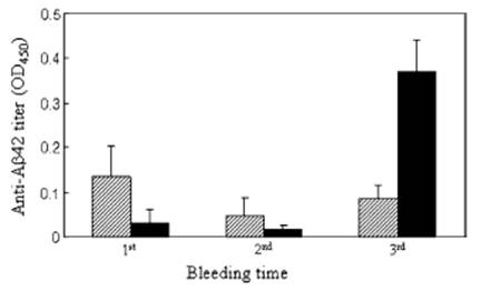 L istogramma è calcolato utilizzando il peptide Ab42 come standard. Ogni barra rappresenta la media di 3 campioni ± errore standard.