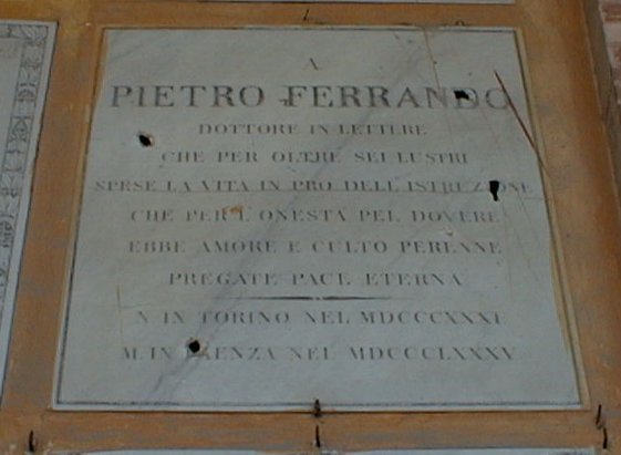 Il 14 giugno 1885 il preside Pietro Ferrando fu trovato morto per suicidio. Le cronache dell'epoca riferiscono delle solenni onoranze funebri resegli dalla scuola: tre giorni di sospensioni delle lezioni, solenne cerimonia con partecipazione di insegnanti ed alunni. Poco chiari i motivi del gesto. Il tono della corrispondenza del 1884-85 (Ferrando, torinese, era a Faenza da solo un anno) lascia intravedere un uomo poco equilibrato. Risulta che la moglie l'anno precedente avesse avuto un parto assai difficile; una lettera di gennaio parla della "gamba disgraziatissima di mia moglie". Niente che spieghi un suicidio. La tomba di Ferrando spicca ancora sulla facciata del cimitero dell'Osservanza di Faenza (portico di destra). Vedi come riporta la notizia un giornale dell'epoca ("Il Lamone") |