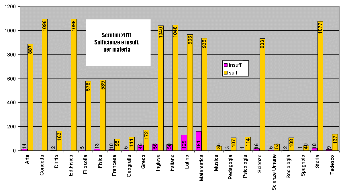 Il grafico mette a confronto il numero valutazioni sufficienti ed insufficienti per ciascuna materia. Non si tiene conto dei casi di alunno "non classificato"; sono invece comprese le classi terminali.