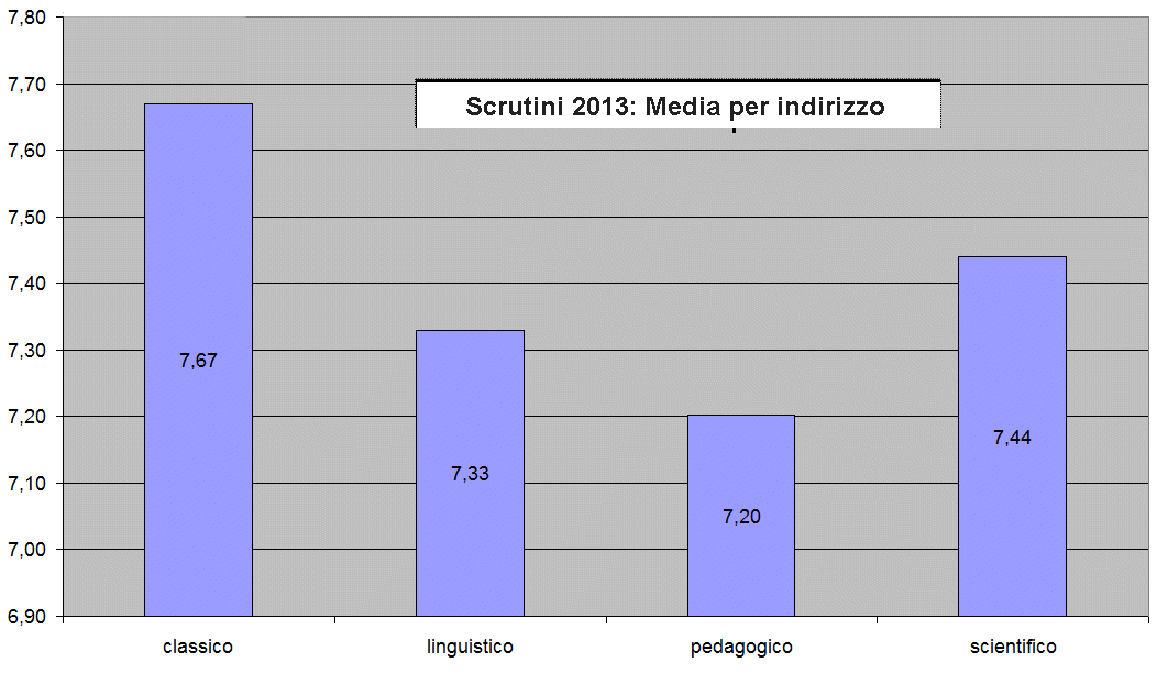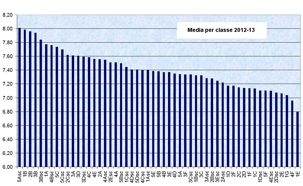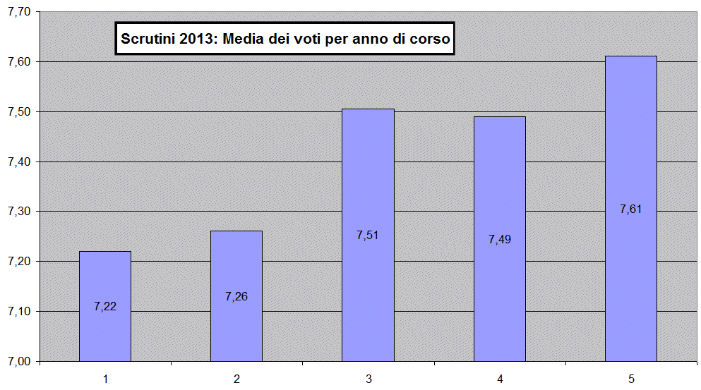 La media generale dei voti di tutta la scuola è di 7,49 per le femmine (+0,13 rispetto allo scorso anno) e di 7,27 per i maschi (+0,02).