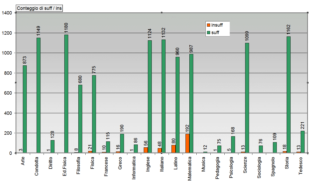 Il grafico mette a confronto il numero valutazioni sufficienti ed insufficienti per ciascuna materia. Non si tiene conto dei casi di alunno "non classificato"; sono invece comprese le classi terminali.
