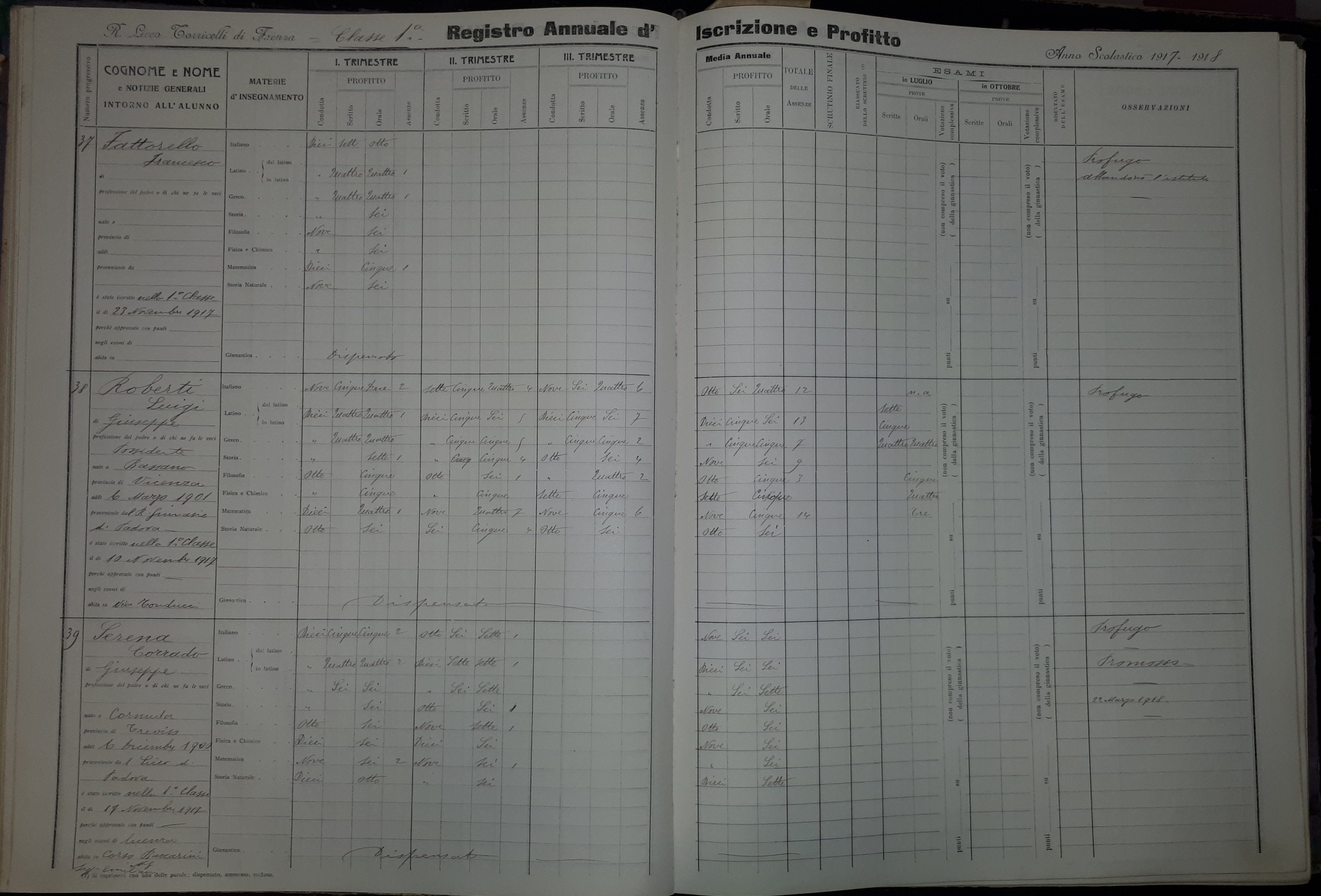 l’afflusso di profughi nelle nostre città e il conseguente trasferimento di studenti nelle nostre scuole. Nell’anno scolastico 1917-18, i registri del Torricelli riportano i nominativi di studenti provenienti dai licei di Udine, di Venezia e di Padova. Furono ventidue studenti in tutto, suddivisi fra le sette classi del Liceo Ginnasio. Sette e non otto, perché quell’anno non fu costituita una terza liceo: i ragazzi del ‘99 erano impegnati altrove... ![]() | |||