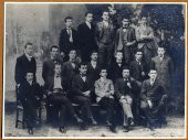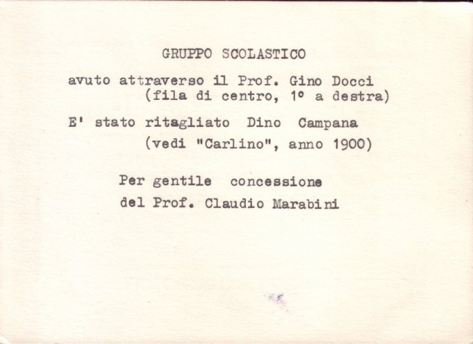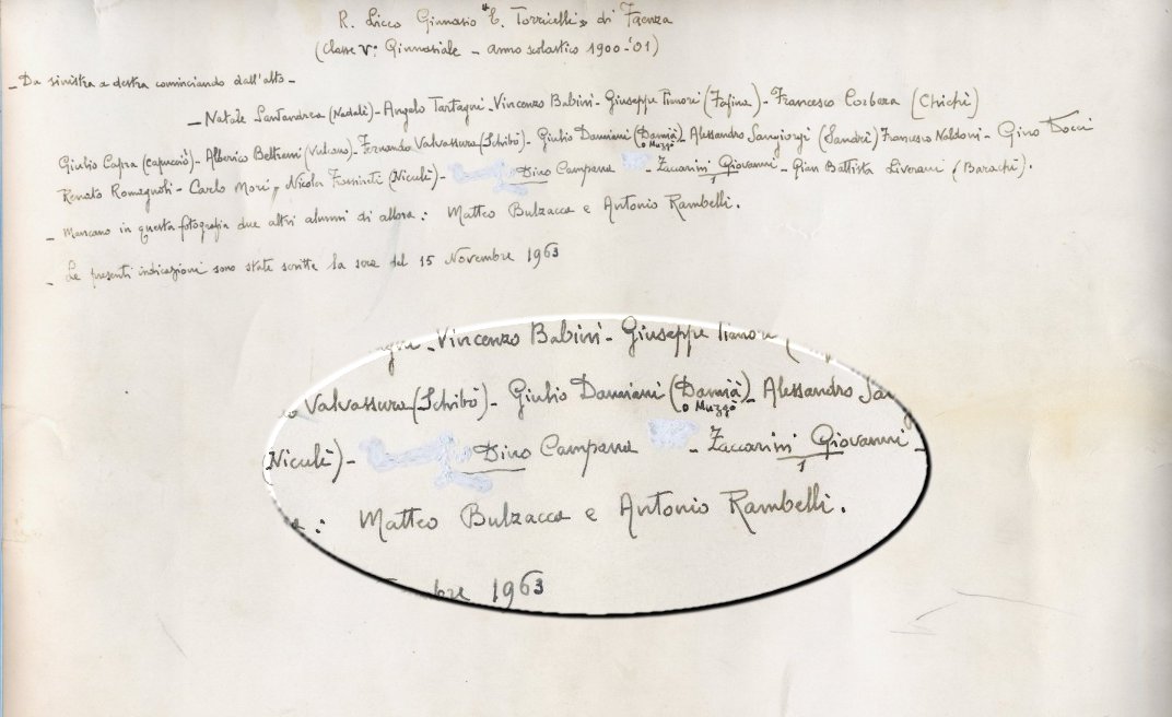 R. Liceo Ginnasio «E. Torricelli» di Faenza / (classe V Ginnasiale - anno scolastico 1900-'01) / - Da sinistra a destra cominciando dall'alto - / - Natale Santandrea (Nadalé) - Angelo Tartagni - Vincenzo Babini - Giuseppe Pianori (Fafina) - Francesco Corbara (Chichì) / Giulio Capra (Capucciò) - Alberico Beltrani (Vulcano) - Fernando Valvassura (Schibò) - Giulio Damiani (Damià o Muzgò) - Alessandro Sangiorgi (Sandrì) - Francesco Naldoni - Gino Docci / Renato Romagnoli - Carlo Mori11 - Nicola Frassineti (Niculé) - Zaccarini Giovanni - Dino Campana - Gian Battista Liverani (Barachì) / - Mancano in questa fotografia due altri alunni di allora: Matteo Bulzacca e Antonio Rambelli12. / - Le presenti indicazioni sono state scritte la sera del 15 Novembre 196313