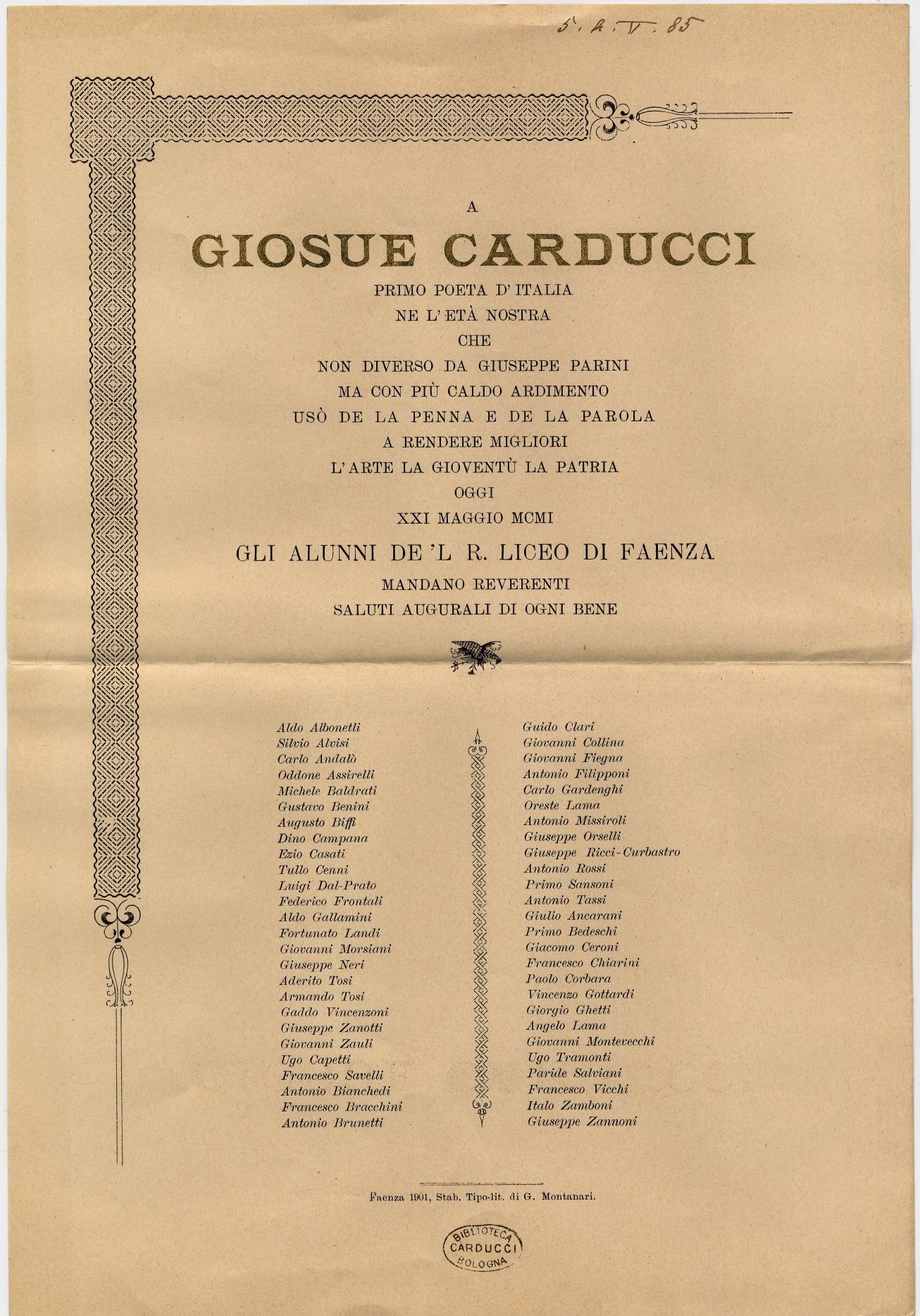 A / GIOSUE CARDUCCI / PRIMO POETA D'ITALIA / NE L'ETÀ NOSTRA / CHE / NON DIVERSO DA GIUSEPPE PARINI / MA CON PIÙ CALDO ARDIMENTO / USÒ DE LA PENNA E DE LA PAROLA / A RENDERE MIGLIORI / L'ARTE LA GIOVENTÙ LA PATRIA / OGGI / XXI MARZO MCMI / GLI ALUNNI DE 'L R. LICEO DI FAENZA / MANDANO REVERENTI / SALUTI AUGURALI DI OGNI BENE