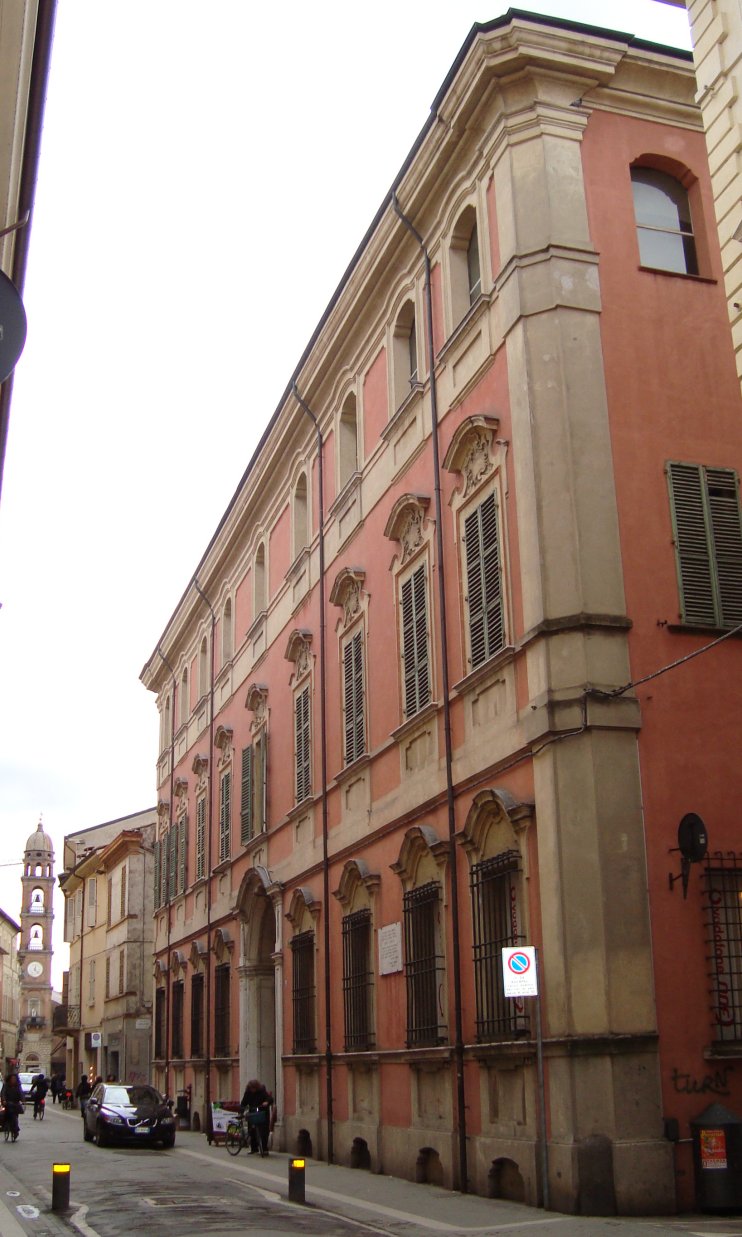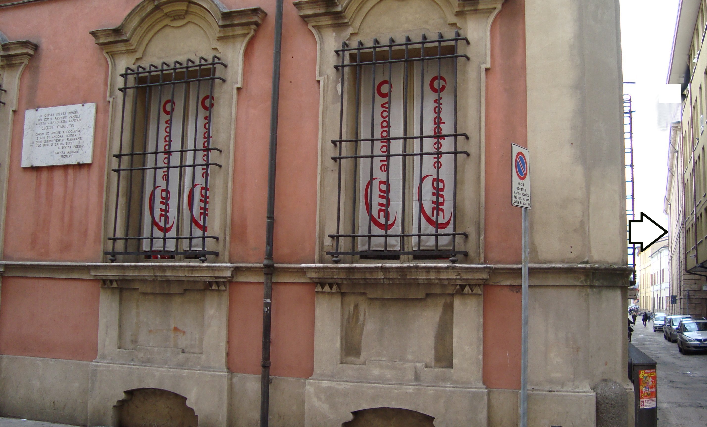 Palazzo Pasolini Zanelli e, a destra, particolare con la lapide intitolata a Carducci. Si intravede, segnalato dalla freccia, il Liceo Torricelli.