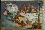 | The Picture The picture we are going to describe is "Achilles cries over the dead corps of his friend Patroclus while Tethys comes to comfort him bringing the new weapons". It was painted directly on the ceiling of the Achilles Gallery. The main characters are: Achilles, Patroclus and Tethys; prominent characters of the Greek mythology. Achilles is the invincible hero, son of Peleus, king of Myrmidons, and Tethys, who together with her brother Ocean are told to be the Titans Couple. Patroclus is the son of Menenzio and Stenele. He is Achilles bosom friend as they grew up together, sharing fun, joy and difficulties. Chirone, the centaur, and Phoenix brought up Achilles. By hiding him among the daughters of Licomedys, king of Sciro, dressed up as a girl, he would have avoided to fight in the Troian war, where he might have found his death. In fact knowing his future destiny his mother tried to prevent him from the labours, the desperation of a courageous warrior. As a boy he fell in love with one of the girls, Deidamia; they had a son Pirrus. In spite of his mothers plans, Ulysses found Achilles and induced him to join the war. The picture deals with Patroclus death after a cruel battle between Greeks and Troians. At first Patroclus was wearing Achilles weapons pretending to be him and hoping this way to scare his enemies, then he went into the battle. Secondly Hector, the famous Trojans warrior, mistaking Patroclus for Achilles, made him succumb. As soon as Achilles got to know what had happened, burst out his desperation and his cries were so loud that Tethys herself heard his mourning. She arrived bringing him the new arms, which had been made by Vulcan, to substitute the old ones. Many authors belonging to the neo-classical age wrote about Achilles and the main characters of the Greek mythology. They revivaled the characteristics of the classical period: balance, harmony, rationality and anthropocentrism. Making some examples, Alexander Pope, Lord Byron, John Keats and Shelley took some characters and themes from classical literature.