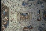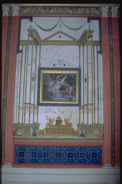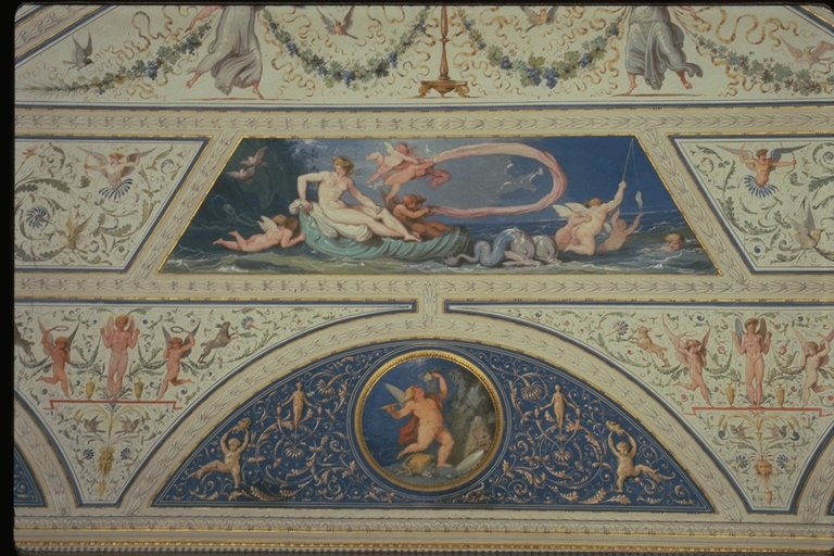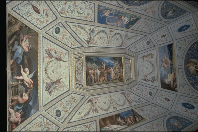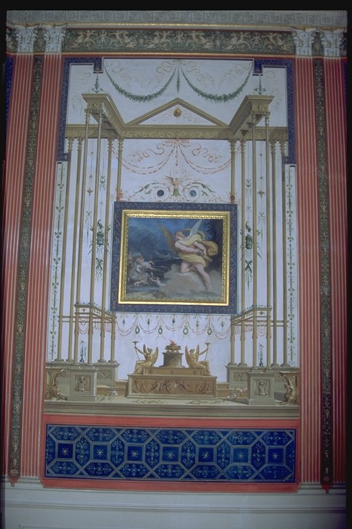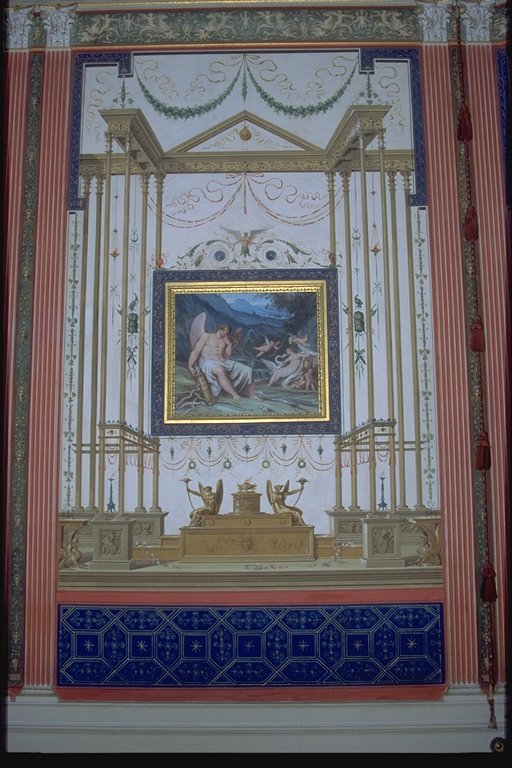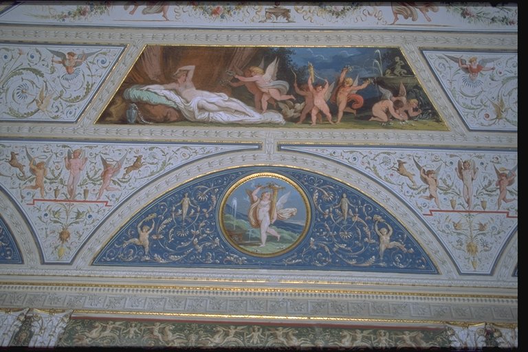Nelle lunette azzurre arabescate si trovano, racchiuse entro tondi, gli Elementi e simbologie di Eros sul tema delle Stagioni: linverno sulla porta del lato corto, sulla finestra lestate, lautunno nella lunetta centrale della parete lunga, in cui si trova la porta e, di fronte, la primavera. Lo spazio lasciato libero dalle scene è miniato con calligrafie raffaellesche su fondo bianco, dal quale emergono colori vividi. |
