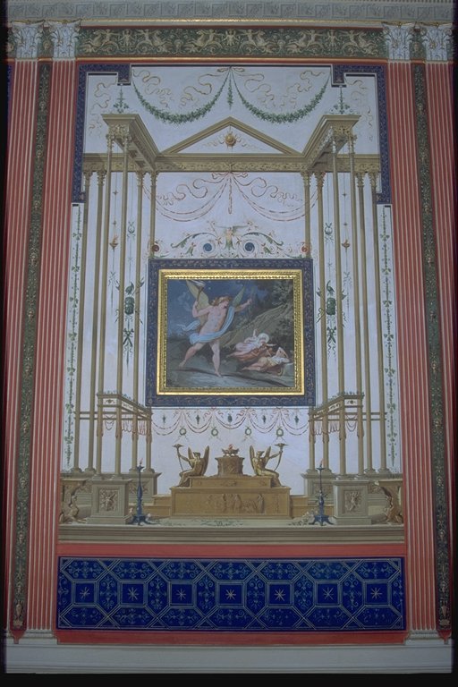 tempietti esilissimi color giallo oro, citazioni dal quarto stile pompeiano. Le pareti