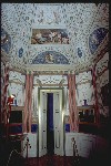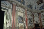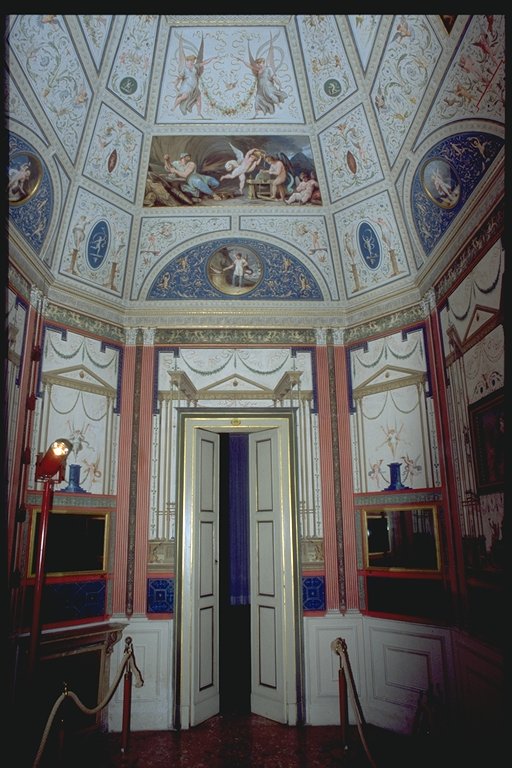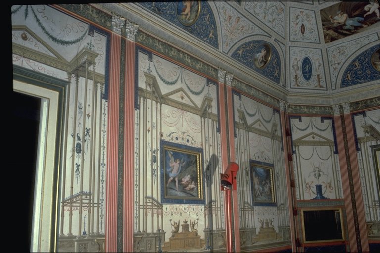 | IL BOUDOIR Il boudoir, salottino privato della giovane moglie del conte Milzetti (Giacinta), usato per conversazione o toilette, è stato realizzato smussando agli angoli il parallelepipedo di partenza, per ottenere una sala ottagonale arricchita da una decorazione che la riveste per intero. La stanza è lunga 7 mt. per 3. 5 mt. La sala ha due porte, una posta su un lato lungo che da accesso alla stanza nuziale, laltra posta su il lato corto, davanti alla finestra, che porta agli ambienti del loggiato. Le porte, piccole e a doppia anta sono laccate in bianco avorio e listellate doro zecchino, lapislazzolo (blu oltremare) e rosso, a formare cornici concentriche. Il tendaggio è bianco, a parte un raffinato drappeggio in stoffa oro nella parte superiore. In questo ambiente i colori predominanti sono: bianco, blu oltremare e rosso, impreziositi da eleganti decorazioni in oro. LE PARETI Si nota un basamento monocromo bianco, con riquadrature prospettiche
