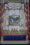 IN THE "BOUDOIR" The boudoir, the room of Count Milzetti s young wife, is decorated over all its walls and ceiling. Very slender structures in trompe doeil way are painted on the walls, and there are also five paintings under glass, which represent five episodes about the Gods loves : Leda and the Swan, Diana and Endimione, abduction of Europe, Phoebus and Daphne, abduction of Proserpina. The first, in particular, is represented in this way : in the foreground, on the left, there is Eros in a white cloak. In the background there is Leda with the Swan surrounded by some Cupids. The landscape is mountainous and, in the distance, you can glimpse a village. The predominant colours are : light blue, green, black, blue and white. On the ceiling, in the center, there is the "Trionfo di Amore" (Triumph of Eros), from Petrarca and it is surrounded by paintings, which represent the Fire, the Water, the Air and the Earth. In the circles there are the allegories of the four seasons. In the four corners of the room there are four mirrors used as doors, behind which there are some shelves.