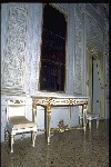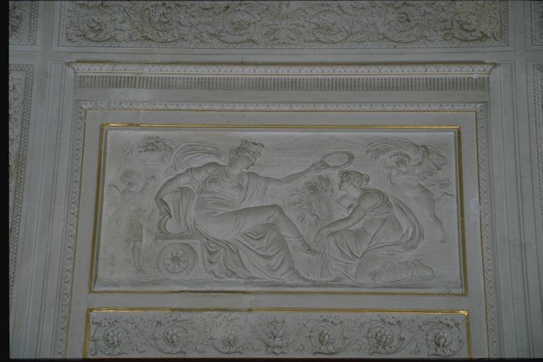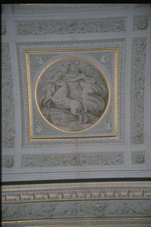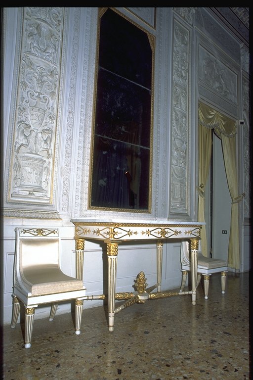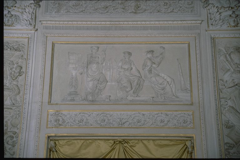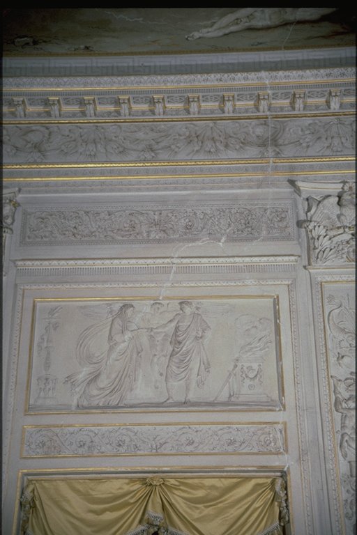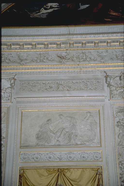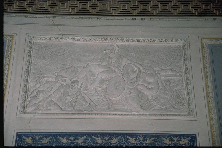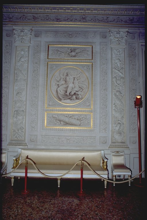 Guerra. Il vasto ambiente a pianta rettangolare, di misure 7,70 per 13,80 metri, è a volta ribassata ed è il più ricco di tutto il palazzo per quanto riguarda la decorazione che, correndo su tutte le pareti, è composta da lesene (decorate a stucco e firmate da Francesco e Gian Battista Ballanti Graziani), stucchi finti dipinti, fregi dorati e tempere situate sul soffitto. Il colore predominante allinterno della stanza è il bianco con decorazioni dorate nelle cornici delle tempere, dei clipei e dei supporti per le tende. Questi ultimi presentano al centro una corona dalloro dalla quale lateralmente si dipartono le tende color oro. La regolarità e la simmetria sono ricercate, come si vede dalluso delle porte finte e dallalternarsi continuo di quattro tipi di stampe per le lesene, in modo tale che motivi identici si ritrovano su lesene fronteggiantesi sulle pareti opposte. I temi più ricorrenti delle decorazioni delle paraste sono motivi militari richiamati dagli elmi, else, armature e corni usati per lincitamento alla battaglia e per festeggiare la successiva vittoria. Troviamo inoltre motivi floreali, grifoni, sagittari e coppie di pesci. Unaquila contornata da foglie adorna i capitelli e la base delle lesene. Queste sono in rilievo ed evidenziano la divisione dei tre clipei, presenti su una sola delle pareti maggiori e contornati da stucchi finti e dipinti con motivi floreali. Allinterno dei tre clipei troviamo tre fra le maggiori divinità greche: Minerva, Giove e Marte, che rimandano alla tematica bellica della stanza. I sei bassorilievi , realizzati dai Ballanti Graziani e collocati sopra le porte , rappresentano Le nozze di Peleo; Le Parche che segnano il nome di Achille; Cerere; Nettuno; Tetide che prega Giove per il figlio Achille; Pirro che fa sacrificare Polissena alla tomba di Achille. Sulle pareti laterali si trovano lunette a tempera raffiguranti scene dellIliade e in particolare Priamo che prega Achille per il corpo di Ettore presentandogli dei doni in oro e Achille che trascina il corpo di Ettore intorno alle mura di Troia. La divisione fra le cinque finestre, presenti sullaltra parete maggiore, è data dallalternarsi di paraste singole e binate. Il soffitto è decorato con tempere raffiguranti scene tratte dallIliade di Omero. Esse raffigurano (a partire dal lato occidentale della stanza) "Crise che con doni prega Agamennone a rilasciargli la figlia Criseide; La disputa di Achille con Agamennone re e generale dei Greci; Achille che perde Briseide, consegnata dallamico agli Araldi di Agamennone che gliela domandano con la forza; Achille che piange sul corpo dellamico Patroclo e Tetide che lo consola portandogli nuove armi; Tetide che afferra le armi fatte da Vulcano per Achille ". Completano la decorazione stucchi finti a motivi floreali, come foglie di quercia e bacche, ed elementi che rimandano alla mitologia greca e quattro clipei disposti sulla volta a botte. Ciascuno di essi raffigura una divinità alata ed un amorino, entrambi aventi in mano delle corone e due cavalli scalpitanti pronti ad un agile scatto. Le tempere di Giani rivelano caratteri tipicamente neoclassici come larmonia, la grazia e leleganza dei gesti e dei movimenti nonostante le scene drammatiche e di forti sentimenti, la cura per i particolari, il panneggio delle vesti, lequilibrio e la naturalezza. Pur se gli elementi di fondo appartengono ad uno stile neoclassico, troviamo anche caratteristiche "preromantiche" , come il senso del mistero, il senso della morte, la visione orrida della vita, scene notturne e temi sepolcrali, che emergono da alcune tempere, come quella in cui il corpo di Ettore viene prima trascinato dalla biga di Achille, poi compianto dal padre Priamo. Il tema predominante nelle scene rappresentate sul soffitto, è quello militare: tema presente nelle tempere, nei clipei e nei bassorilievi, in quanto la famiglia Milzetti prese parte allesercito napoleonico, durante la campagna dItalia. Questo salone, adibito alle feste, aveva una funzione pubblica e rappresentativa e la scelta del tema decorativo, ossia la narrazione di alcuni episodi dellIliade, voleva essere sfoggio dellimportanza della famiglia Milzetti in campo militare. Larredamento è costituito da tre divanetti, dodici sedie e due consolles, risalenti alla metà dell800 e acquistate dai conti Rondinini (proprietari posteriori ai Milzetti), mentre i preziosi portacandele fanno parte dellarredamento originale. La bianca struttura delle sedie, ricoperta da stoffa color oro è decorata nello schienale e nei piedi da motivi dorati. I tre divanetti, strutturati come le sedie, hanno braccioli sorretti da due grifoni in oro. I due tavoli, bianchi con decorazioni floreali in oro, sono posti sotto i due grandi specchi dotati di una cornice dorata. I quattro lampadari, a candela, di cristallo sono appesi tramite un sostegno di ferro, avvolto in tessuto color oro. Le porte bianche hanno rifiniture color oro e blue e, a due a due, portano rispettivamente alla Sala ottagonale, alla Sala di compagnia ed alla Sala con allegorie della Pace e della Guerra. Il pavimento infine è stato realizzato con la tecnica della palladiana. (Composizione: bianco Naxos = 30%, giallo Siena = 30%, Bardiglio = 10%, rosso Verona = 10%, rosso Francia = 10%, pietra dIstria = 10%) |