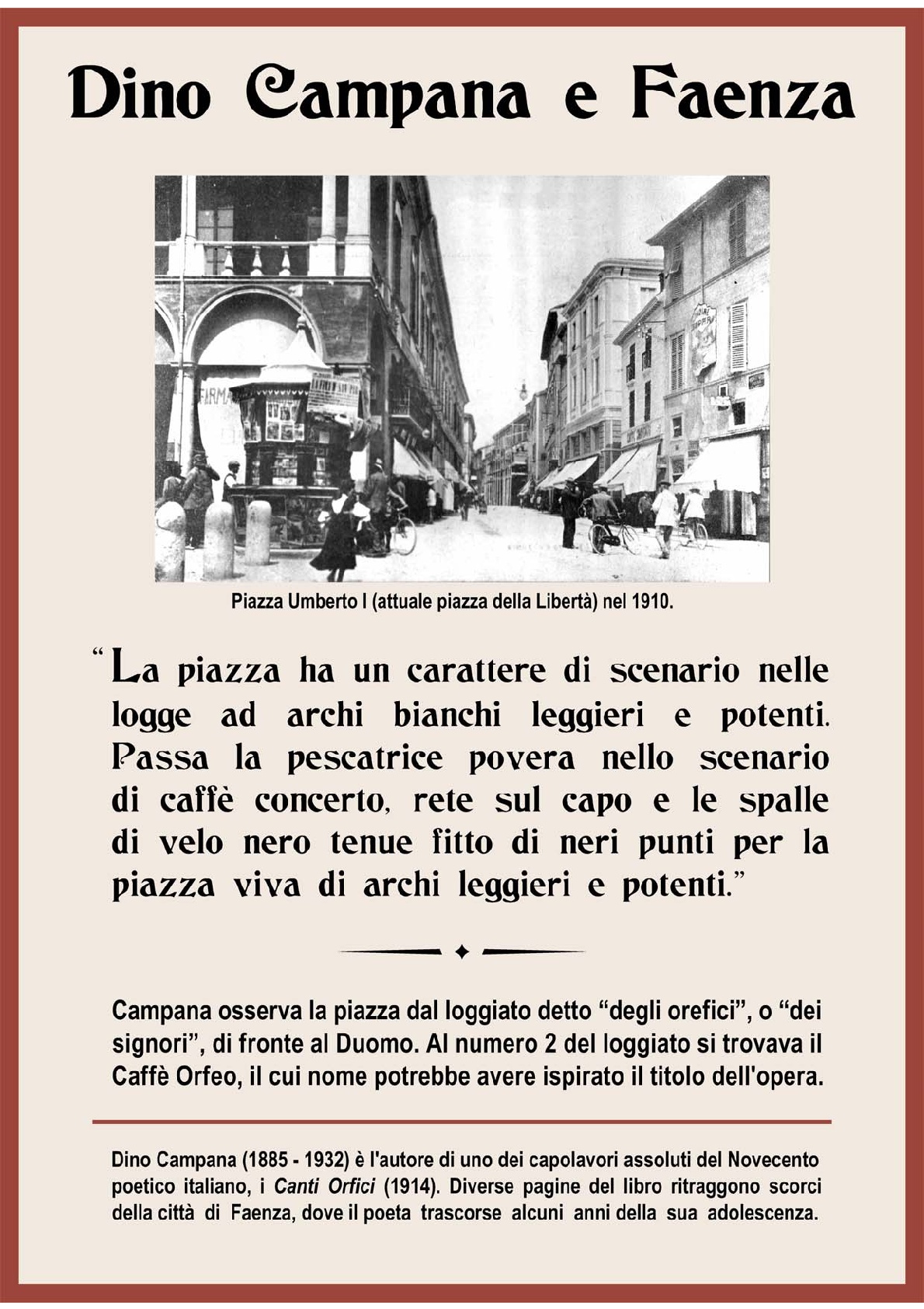 Dino Campana (Marradi 1885 - Scandicci 1932) è l'autore di uno dei capolavori del Novecento poetico italiano, i Canti Orfici (1914). Diverse pagine del libro ritraggono scorci della città di Faenza, dove il poeta trascorse alcuni anni della sua adolescenza.