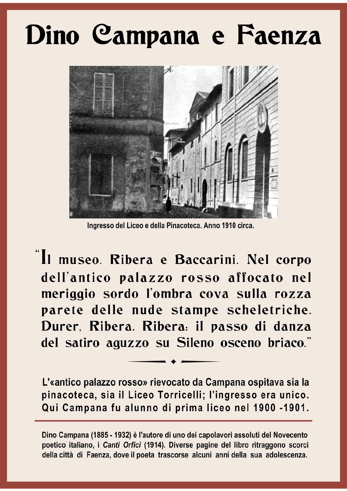 “L’antico palazzo rosso” rievocato da Campana ospitava ed ospita tuttora sia la pinacoteca, sia il Liceo Torricelli; l’ingresso era unico. Al Torricelli, Campana superò da privatista gli esami di terza (1898) e quinta ginnasio (1900) e fu quindi alunno di prima liceo (1900-1901). Dai Canti Orfici si possono ricostruire almeno due visite di Campana alla pinacoteca. La prima è anteriore al settembre 1910, la seconda è probabilmente della primavera del 1914.
