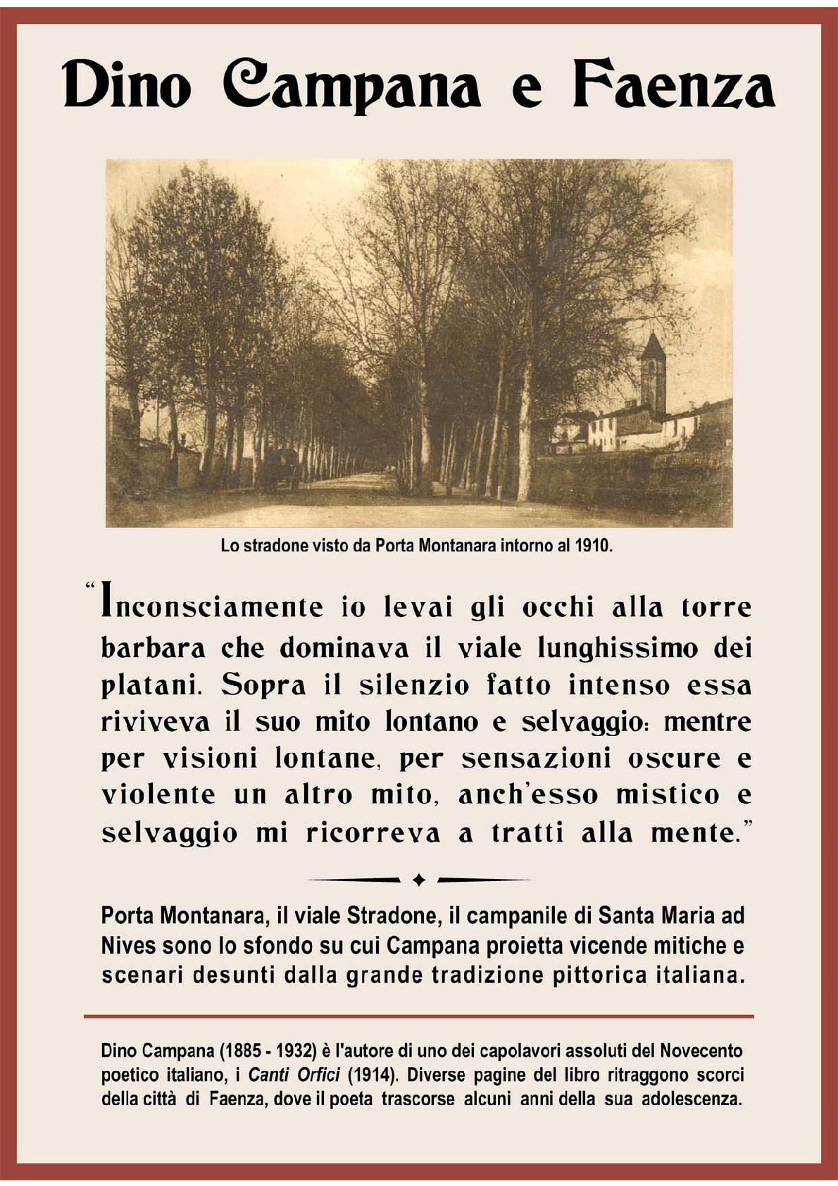Dino Campana (Marradi 1885 - Scandicci 1932) è l'autore di uno dei capolavori del Novecento poetico italiano, i Canti Orfici (1914). Diverse pagine del libro ritraggono scorci della città di Faenza, dove il poeta trascorse alcuni anni della sua adolescenza.