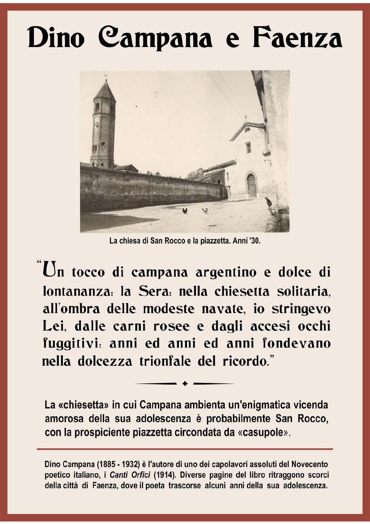 Dino Campana (Marradi 1885 - Scandicci 1932) è l'autore di uno dei capolavori del Novecento poetico italiano, i Canti Orfici (1914). Diverse pagine del libro ritraggono scorci della città di Faenza, dove il poeta trascorse alcuni anni della sua adolescenza.