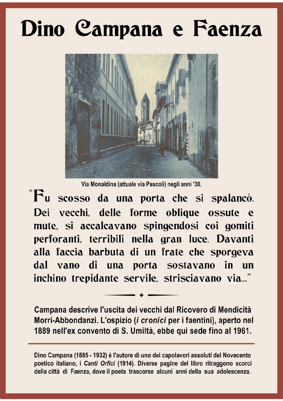 Dino Campana (Marradi 1885 - Scandicci 1932) è l'autore di uno dei capolavori del Novecento poetico italiano, i Canti Orfici (1914). Diverse pagine del libro ritraggono scorci della città di Faenza, dove il poeta trascorse alcuni anni della sua adolescenza.
