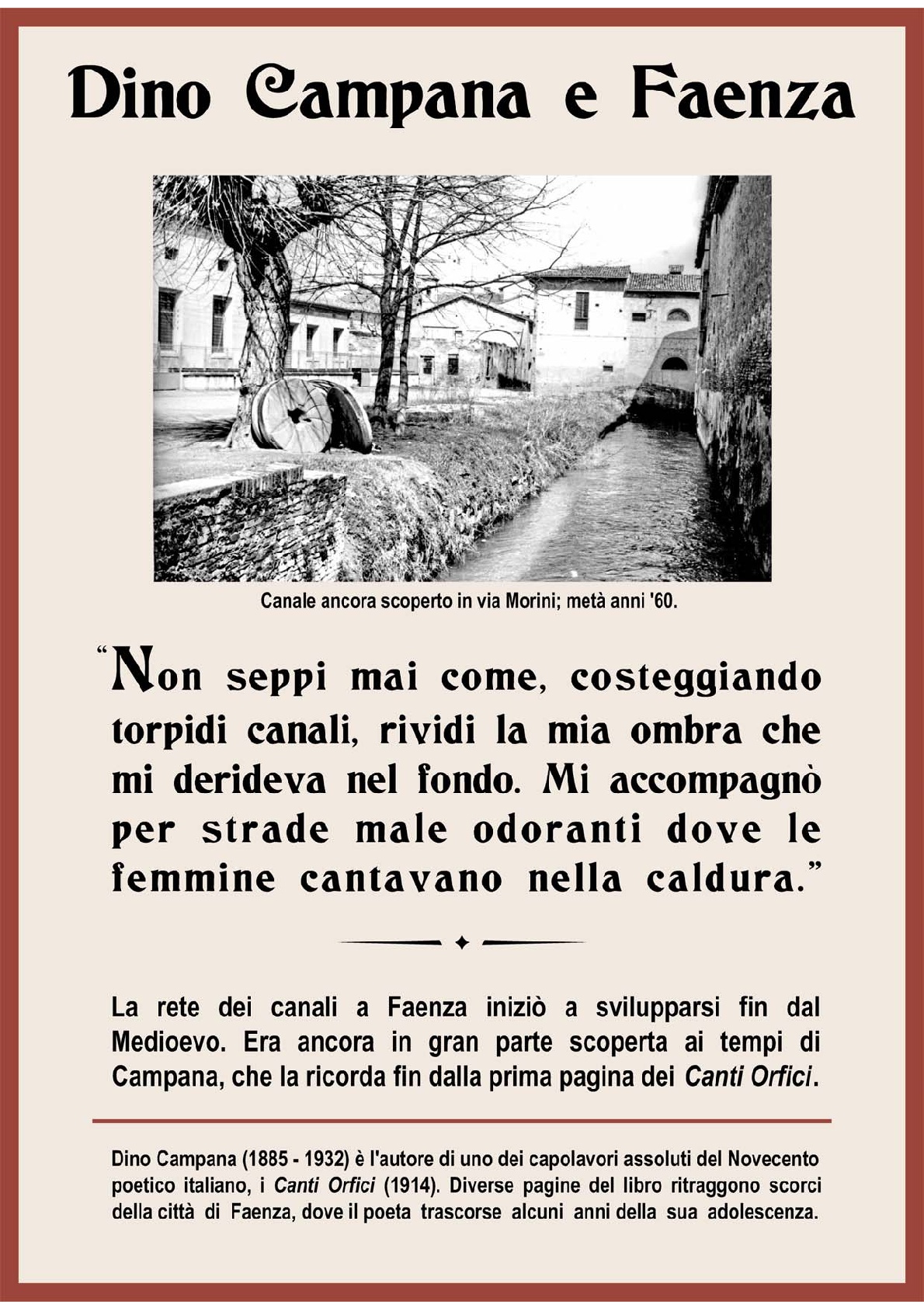 La rete dei canali faentini iniziò a svilupparsi nel Medioevo ed ebbe un ruolo importante nella vita economica della città, fino al XIX secolo. Era ancora in gran parte scoperta ai tempi di Campana, che la ricorda fin dalla prima pagina dei Canti Orfici.