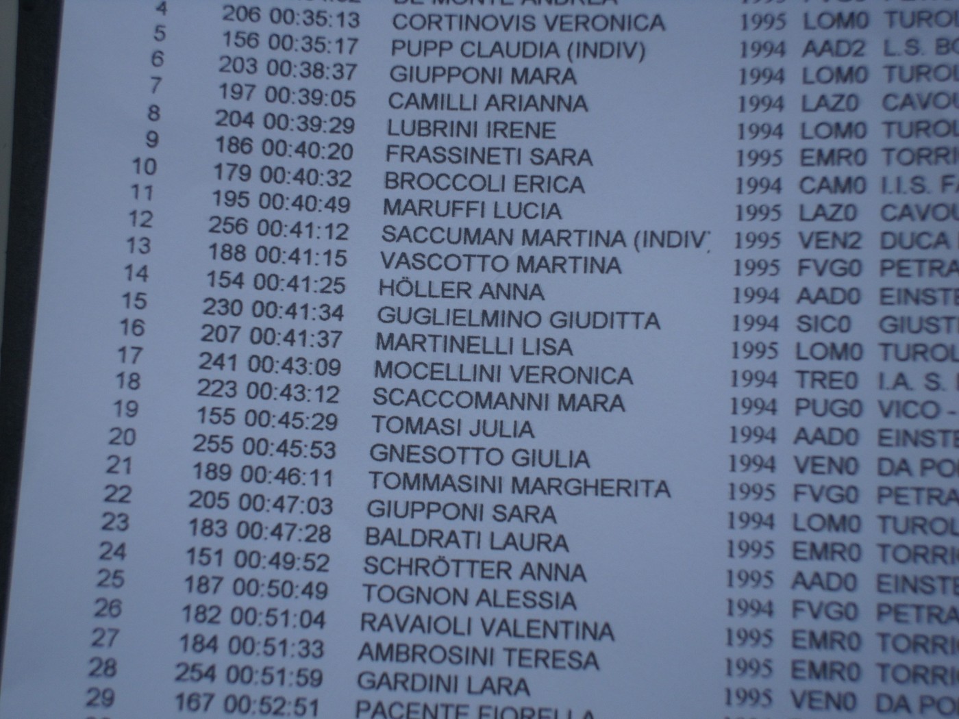 Su tutte l’acuto di Sara Frassineti capace di classificarsi 7^ assoluta nonostante un errore a metà gara che ha in parte compromesso una prestazione da podio. E splendida è stata anche la prestazione delle compagne con il 20° posto di Laura Baldrati, il 23° di Valentina Ravaioli, il 24° di Teresa Ambrosini ( quattro nelle prime ventiquattro!) e il 79° di Barbara Giorgi. Su di loro sono riposte molte aspettative anche per l’edizione del 2011 dei G.S.S. (tutte le ragazze erano al 1° anno di categoria).