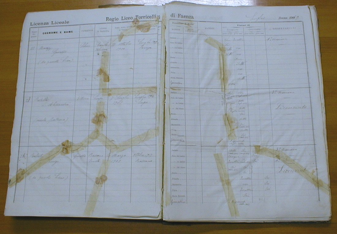 Nei registri degli anni '40, di ogni alunno sono indicate l'età, ( ) la condizione del padre, l'ingegno (sono usate espressioni come "molto", "moltissimo", "mediocre", "tardo", "di buona speranza", " di poca speranza", "di qualche speranza", "di massima speranza"), la frequenza ("continua", "poca", "pochissima"), la diligenza ("massima", "molta", "poca", "niuna"), il profitto (sono le stesse espressioni usate per la diligenza), e infine "le presenze alla congregazione" e "ai sacramenti". Nell'elenco delle professioni è assai frequente la condizione di possidente, ma tutte le classe sociali sono rappresentate. Ecco le professioni dei padri in una classe del 1848: due canepini, tre capellai, un contadino, tre falegnami, un fattore, un flebotomo, un fornacciaro, un impiegato, un macchinista, un magazziniere, un matassaro, quattro mercanti, un muratore, quattro possidenti, un suonatore. Con l'annessione di Faenza al regno sabaudo, si passa ai voti in decimi (vedi il registro di Alfredo Oriani). Nel 1887 il ginnasio viene annesso al liceo. Ma i registri rimarranno distinti.