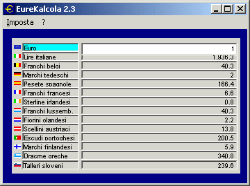 Eurekalcola 2.3 (aggornato con il tallero sloveno!)E' un'utility che serve alla conversione fra le varie monete aderenti all'Euro.- Presenta già incorporati i rapporti di cambio fissati il 31-12-1998 - L'immissione dei dati è particolarmente rapida: non c'è nemmeno bisogno di selezionare la moneta di input - La conversione avviene in corso di digitazione fra tutte le diverse valute - Il programma incorpora una calcolatrice: mentre esegue le operazioni, le cifre vengono visualizzate secondo le quattordici (1+13) differenti valute. Per Windows 95 e successivi: solo 40 Kb zippato |