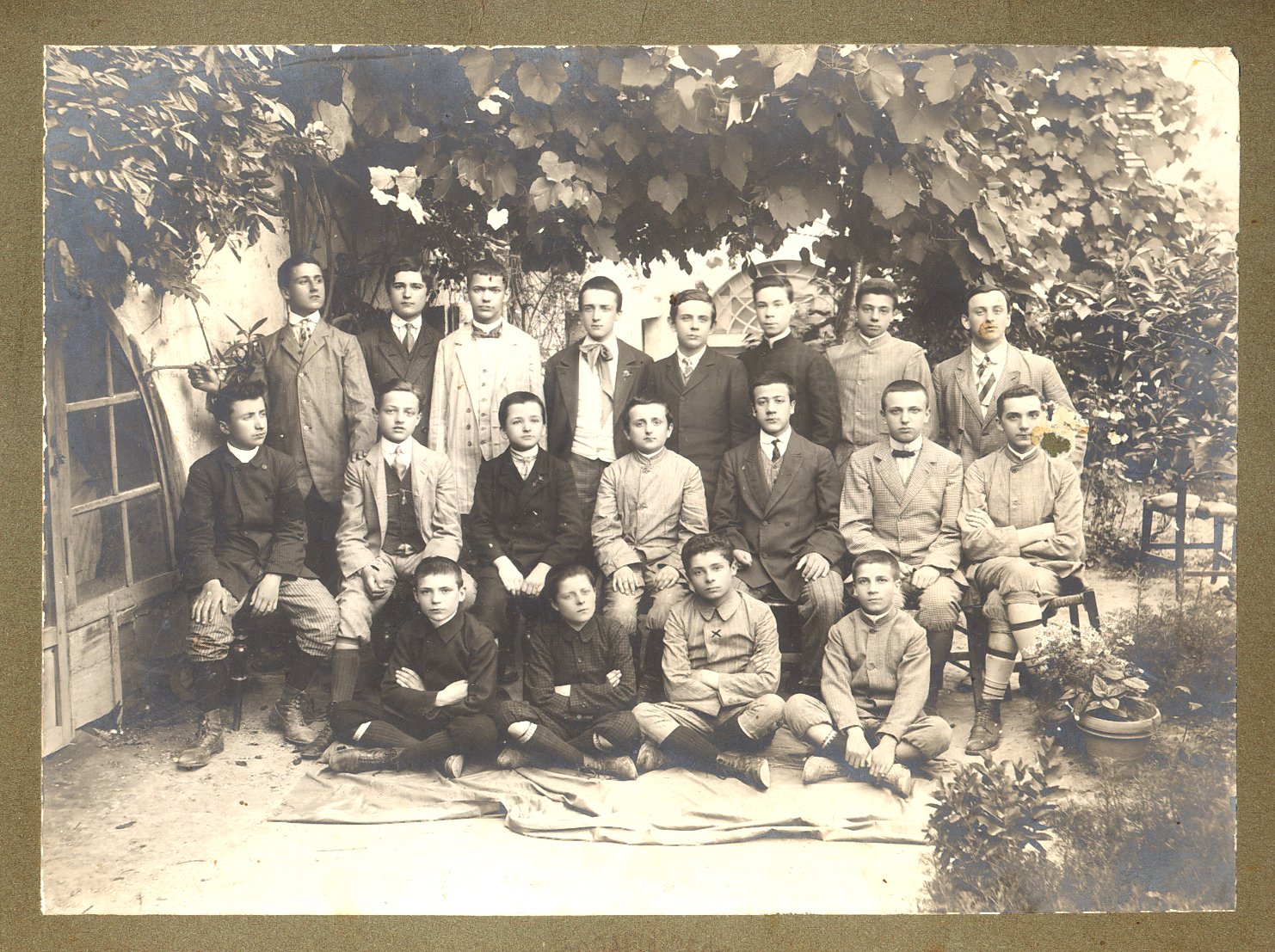 Il terzo seduto in terra è Virgilio Marcucci, figlio del sindaco di Faenza Gallo Marcucci. Sulla cornice di cartone il timbro "Fotografia Resta / corso Mazzini N.66 / Faenza" e sul verso la scritta "Virgilio Marcucci / Ginnasio o I Liceo"