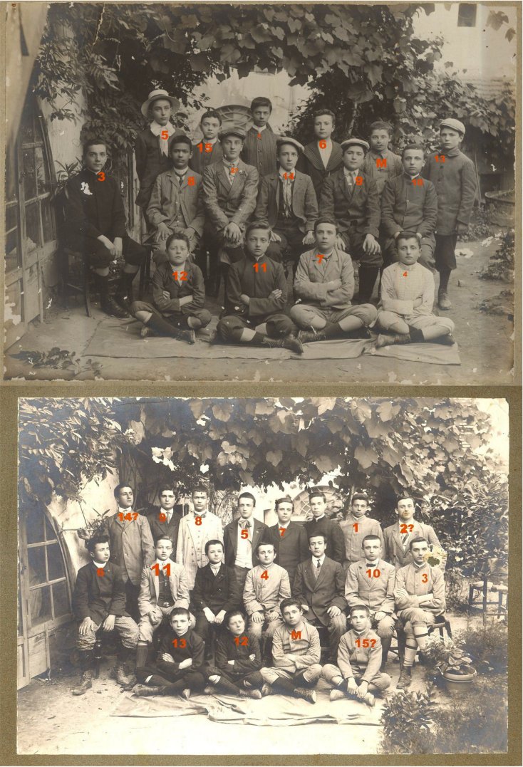 Il recente ritrovamento della foto della rappresentativa di ginnastica del 1911 ci permette di identificare con certezza Ugolini (terzo della fila centrale) e Colantonio (quinto della stessa fila) nonché probabilmente Spighi (primo a sinistra in piedi) e Rodighiero (ultimo in piedi). Rispetto a quella foto però qui sembrano più giovani. Questo ci ha indotti a mutare l'attribuzione di questa classe, che in precedenza era stata identificata coma la quinta ginnasiale del 1910-11. Inoltre, nella foto dell'anno precedente mancano Ugolini e Colantonio che infatti fecero al Torricelli la quarta ginnasio, ma non la terza.