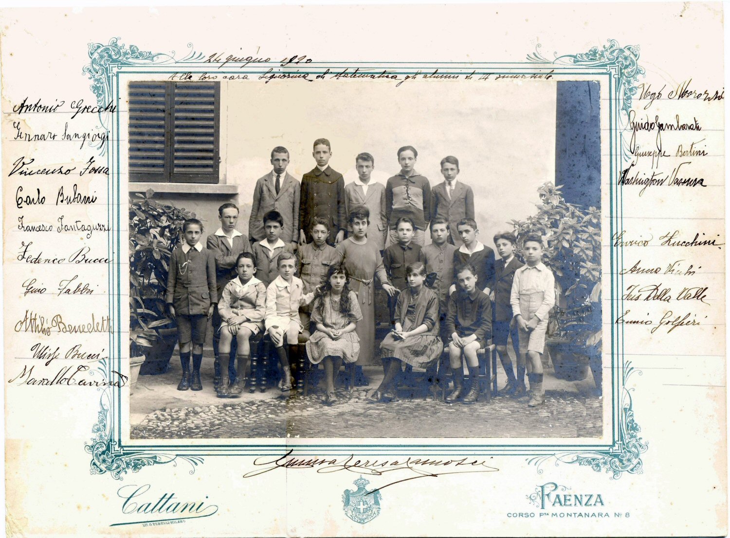 Federico Bucci, Gino Fabbri, Attilio Benedetti, Ulisse Bucci, prof. Emma Teresa Camosci (che però era l'insegnante di lettere; quella di matematica si chiamava Giannina Angeletti), Marcello Cavina, Ugo Morozzi, Guido Gamberati, Giuseppe Bertini, Washington Vassura.