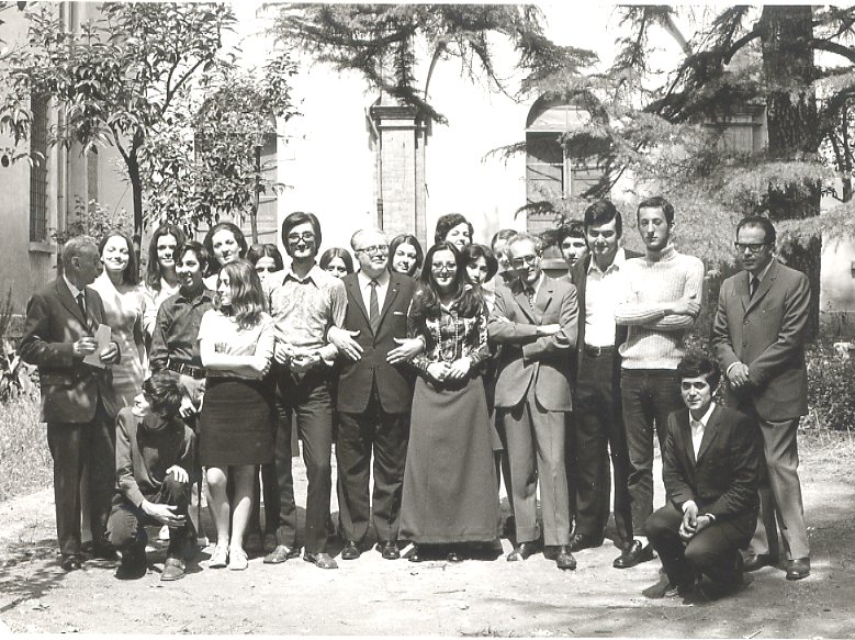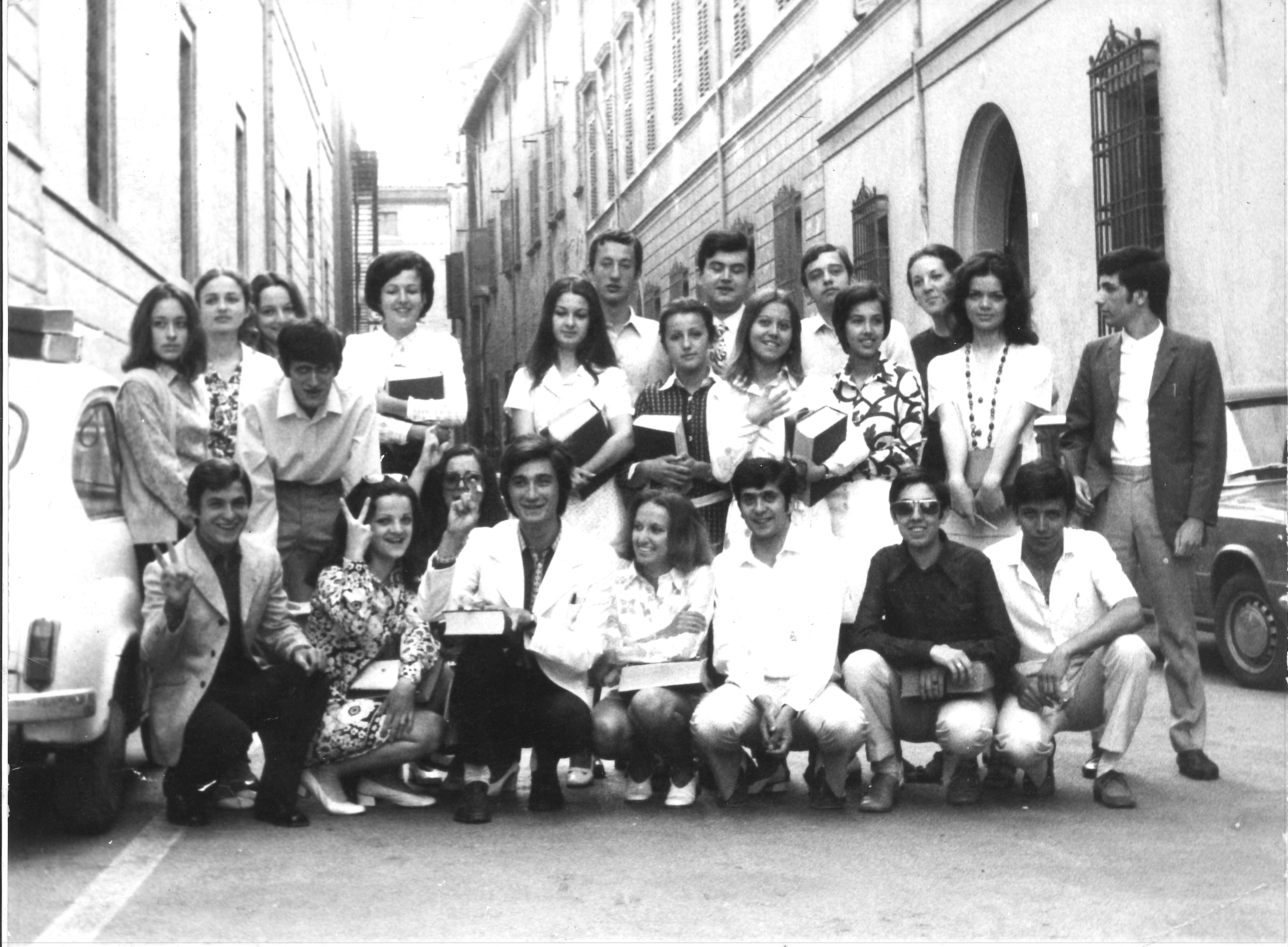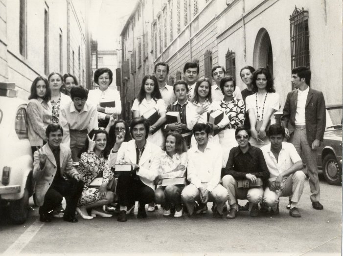 Foto scattata, come attestano i vocabolari, mentre si attendeva di entrare nella scuola per sostenere una prova scritta dell'esame di maturità: probabilmente, la prova di greco, che si svolse l'8 luglio 1970.