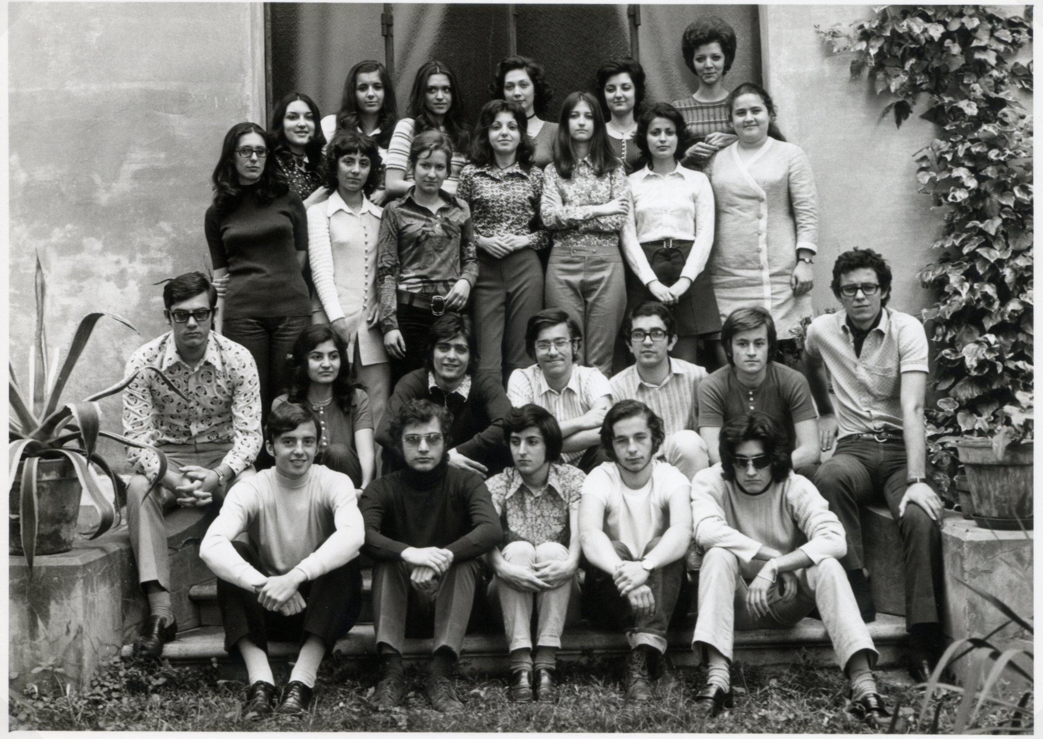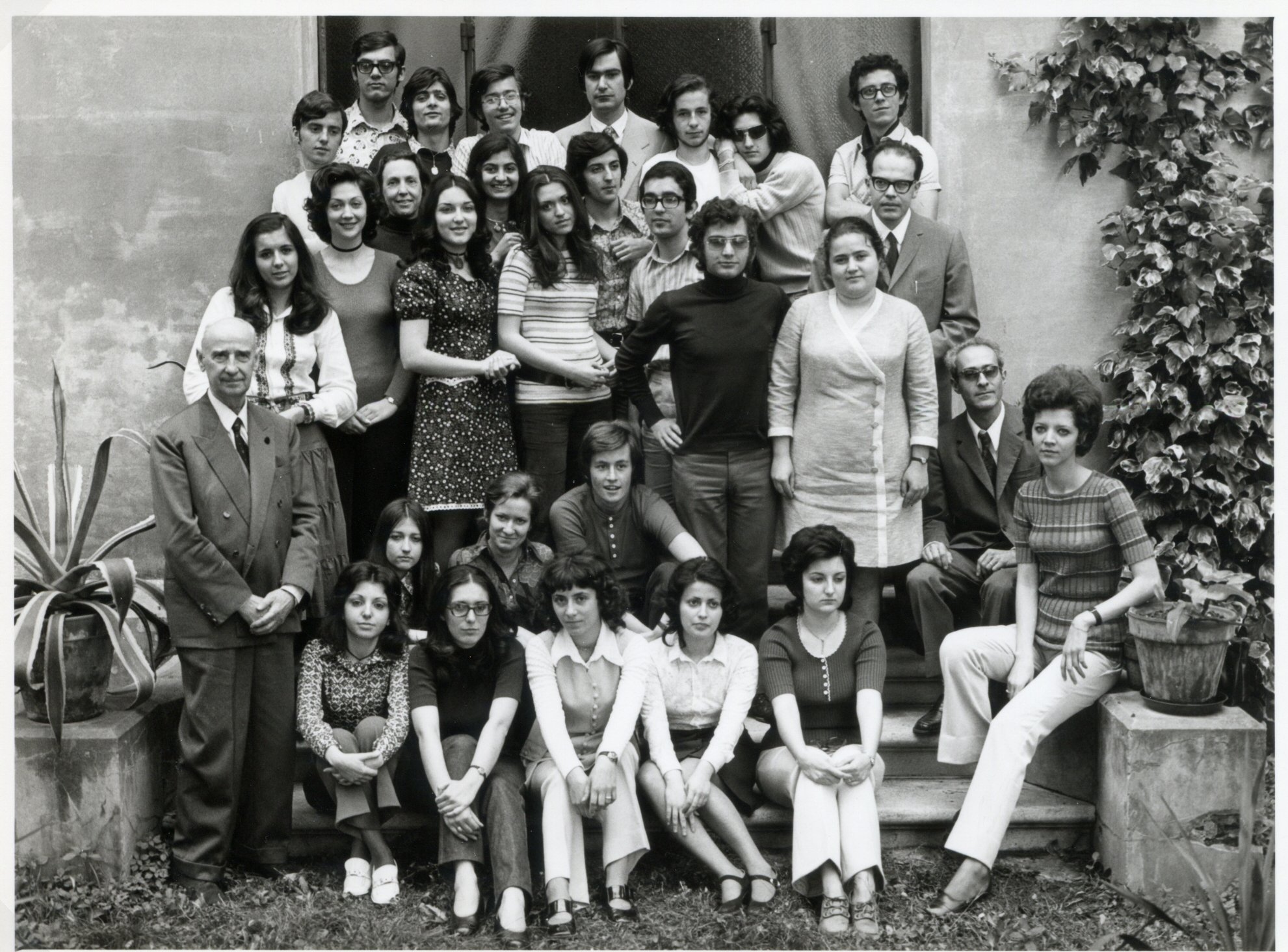 Cristina Todeschini, Anna Bassi, prof. Wanda Morini Messina (educazione fisica), Rita Ghirardini, Elena Carboni, Daniela Savorani, Arturo Cenni, Paolo Bricchi, Fabio Casamassima, Anna Tanganelli, prof. Erio Tampieri (italiano, dietro), prof. Giovanni Pini (lettere classiche, seduto pił in basso).