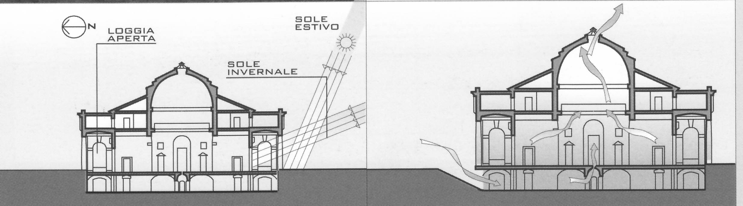 Vicenza, Italia La riscoperta di temi classici utilizzati da Palladio nel periodo rinascimentale è il punto di partenza non solo per rifondare un linguaggio architettonico che recupera e rinnova antichi significati dell’architettura classica ma anche per ritrovare antichi equilibri di armonia tra architettura e natura, tra aspetti bioclimatici e caratteri psicologico-fruitivi, tra qualità della luce e comfort visivo. In effetti vi sono nella famosa opera della Rotonda diverse strategie straordinariamente attuali per mettere in atto l’obiettivo di ottimizzazione del rapporto architettura/natura e bioclimatici/comfort: innanzitutto l’importante uso della loggia, posta su tutti e quattro i lati dell’edificio, che fa acquistare a questa tipologia di spazio aperto-coperto un nuovo valore di comfort visivo, luminoso e abitativo; poi vi è il magistrale impiego nella Villa dei sistema di flussi ventilativi freschi che provengono da appositi canalizzazioni sotto terra, si immettono dal basso al centro dell’edificio, si distribuiscono uniformemente nell’interno ed escono dalla cupola in alto, ai centro dei quattro assi; infine, è da notare l’impiego di illuminazione naturale dall’alto, dirottata negli ambienti interni da una sorta di camino solare posto in sommità della cupola.