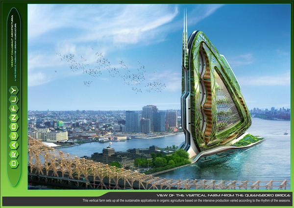Per ovviare alla forte densità demografica, Dragonfly si estende verticalmente sotto forma di torre bionica trasferendo un nuovo biotopo urbano per la fauna e la flora locale e ricreare una produzione alimentare auto-gestita dagli abitanti del cuore della Grande Mela. Piano per piano, la torre permette non solo l'allevamento atto a garantire la produzione di carne, latte, uova e pollame, ma anche il suolo agricolo, con le culture che si diversificano e si susseguono verticalmente in base alla loro capacità di cedere alcuni elementi alla terra. La torre, vero organismo vivente, diventa così metabolica e autosufficiente per acqua, energia e bio-fertilizzanti.