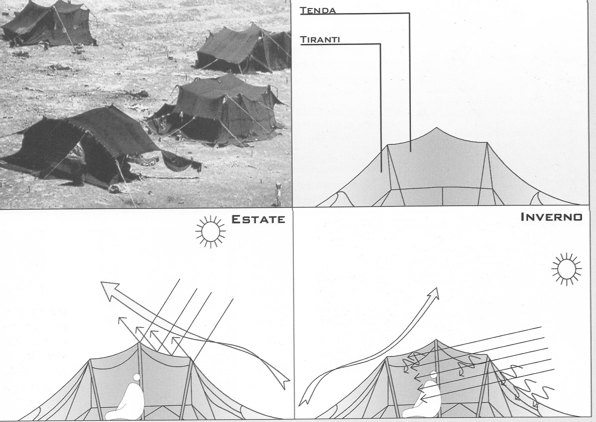 ABITAZIONI TEMPORANEE DEI TUAREG, Nigeria Nello studio di casi caratterizzati dall’inserimento ottimale in climi estremi, particolarmente interessante è quello delle abitazioni temporanee dei Tuareg nigeriani, smontabili, trasportabili e smontabili con grande velocità, facilità e semplicità, ma allo stesso tempo solide ed incredibilmente versatili dal punto di vista prestazionale bio-climatico. Le tende, fatte di strisce di tela ricavata dal pelo delle capre cucite a formare delle grandi coperture, se esposte a temperature fredde cominciano ad assorbire umidità e, anziché raffreddarsi, aumentano di 2-3 gradi la loro temperatura: questa reazione ritarda fino a 4 ore il raffreddamento complessivo del tessuto, dando modo al corpo umano presente all’interno di adattarsi gradualmente alla nuova situazione ambientale. La lana delle tende inoltre, grazie anche alla speciale materia cerosa e grassa che riveste le sue fibre, assorbe solo il vapore acqueo ma non l’acqua, e quindi è idrorepellente. Esposte alle alte temperature estive, le tende offrono ugualmente un ambiente interno gradevole perchè le proprietà della lana offrono parimenti notevoli capacità di isolamento dal caldo. Una fibra di lana assomiglia al tronco di una pianta tropicale: la sua struttura esterna infatti è un rivestimento di scaglie sovrapposte fra loro come le tegole di un tetto, fatte di cheratina. La lana è una fibra igroscopica, in grado cioè di assorbire vapore acqueo senza dare la sensazione di bagnato. Per questo viene usata come capo d’abbigliamento dai Tuareg: può assorbire il sudore e poi trasferirlo all’esterno, fornendo una benefica termoregolazione. La sua principale caratteristica però è la lentezza nella trasmissione del calore, cioè un elevato potenziale di isolamento termico al caldo e al freddo. L’isolamento è in sostanza la quantità d’aria che le fibre riescono ad intrappolare. Le scaglie di lana danno alla fibra una certa ruvidezza e con i loro interstizi ne aumentano la superficie. Risultato: le fibre di lana riescono a trattenere una maggiore quantità d’aria.