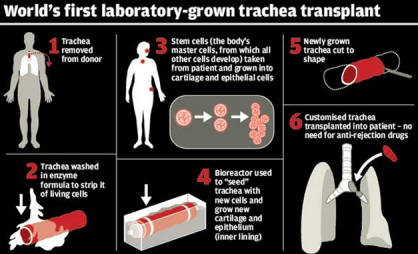 È del 2008 la notizia del primo trapianto al mondo di un organo ricostruito con cellule staminali, da parte del team medico del chirurgo italiano Paolo Macchiarini. È stata prelevata la trachea da un donatore morto, ed è stata successivamente de-cellularizzata in modo da fornire un supporto privo di antigeni. All'interno di un bioreattore l'organo è stato ripopolato con cellule epiteliali e mesenchimali derivate da cellule staminali della ricevente (ottenute con prelievi dalle mucose e dalla cute) in modo da costruire un organo pienamente compatibile con l'organismo. L'innovazione che rende "primo al mondo" questo